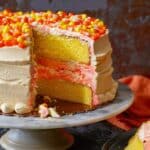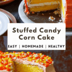 Stuffed Candy Corn Cake is a festive Halloween dessert featuring colorful yellow, orange, and white cake layers filled with hidden candy in the center. With its fun presentation and sweet surprise, this easy vanilla cake is perfect for parties and fall celebrations.