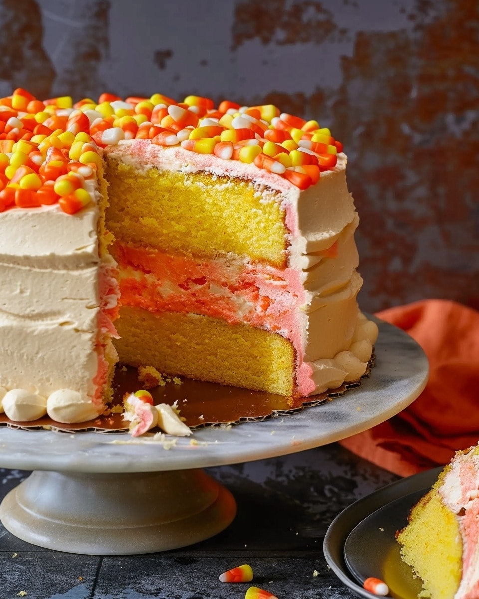 Sometimes I use chocolate cake instead of vanilla for a fun contrast. I’ve also tinted the buttercream in candy corn colors to match the inside layers. For a shortcut, I use boxed cake mix — one vanilla cake mix is usually perfect for three 8-inch layers. I’ve even filled the center with Halloween toys or wrapped surprises instead of candy for themed parties.