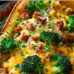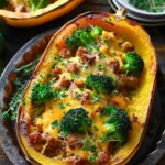 A cozy and satisfying stuffed spaghetti squash filled with savory sausage, tender broccoli, and melted cheddar cheese, offering a lighter yet hearty alternative to pasta.