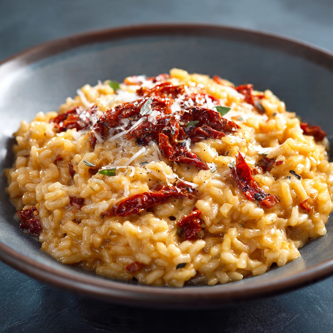 A creamy, comforting risotto made with Arborio rice, tangy sun-dried tomatoes, parmesan cheese, and fresh herbs for a rich and elegant dish.