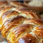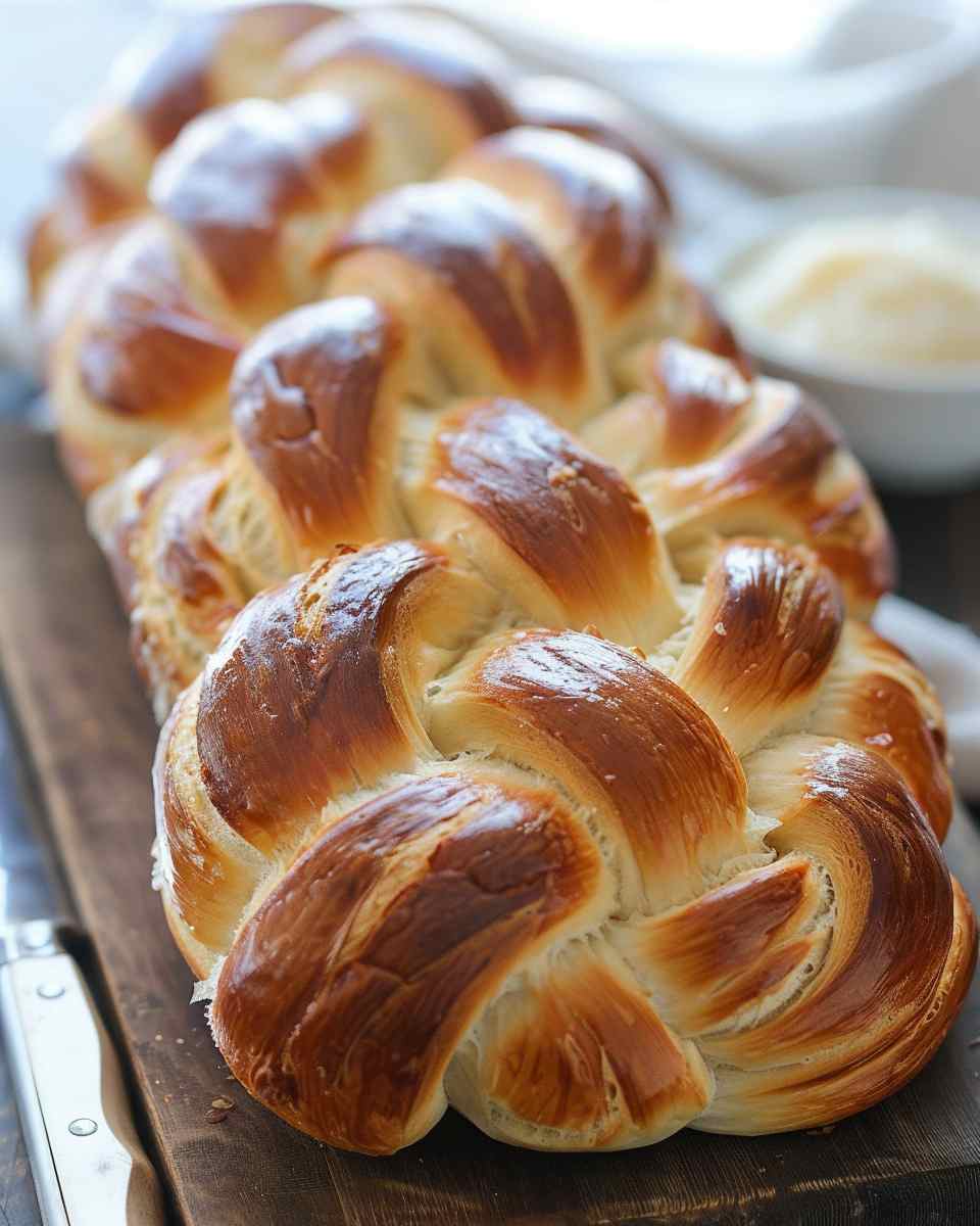 A soft, fluffy, and slightly sweet braided bread with a golden crust, perfect for breakfast or a comforting homemade treat.