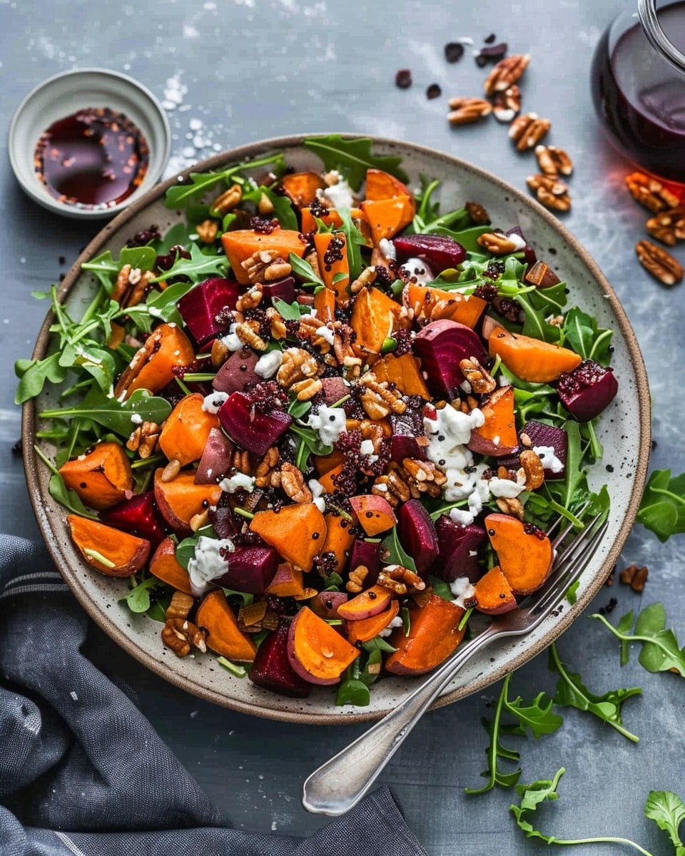 I store the roasted vegetables separately from the greens and dressing to keep everything fresh. The salad components last up to 4 days in the fridge. I reheat the sweet potatoes and beets slightly if I want a warm salad or enjoy everything cold for a quick meal.