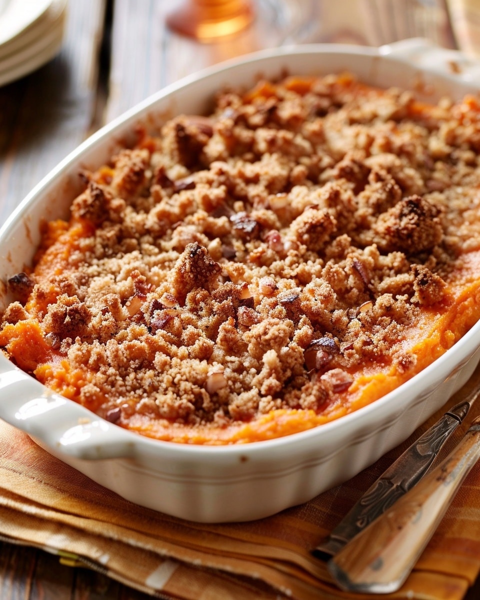 - Sprinkle the topping evenly over the sweet potato mixture.