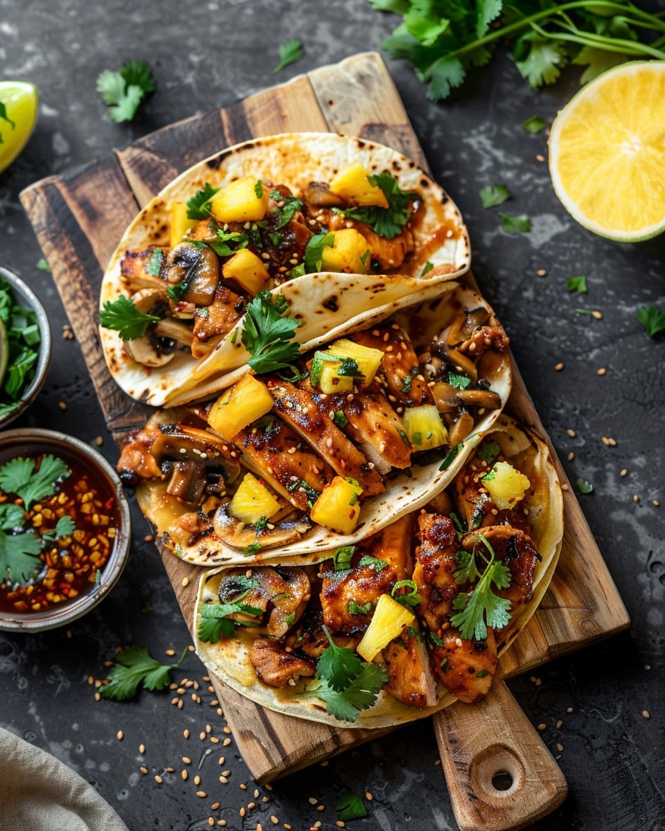Bold and vibrant tacos filled with sweet pineapple, savory chicken, earthy mushrooms, and a spicy-sweet gochujang sauce for a flavorful, satisfying meal.
