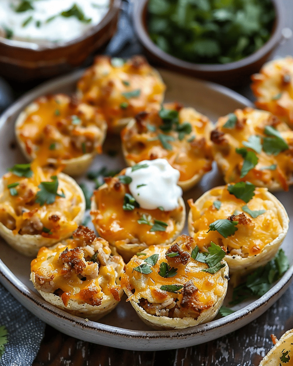 I spoon the taco filling into each dough cup or phyllo shell, then top with remaining cheddar cheese.