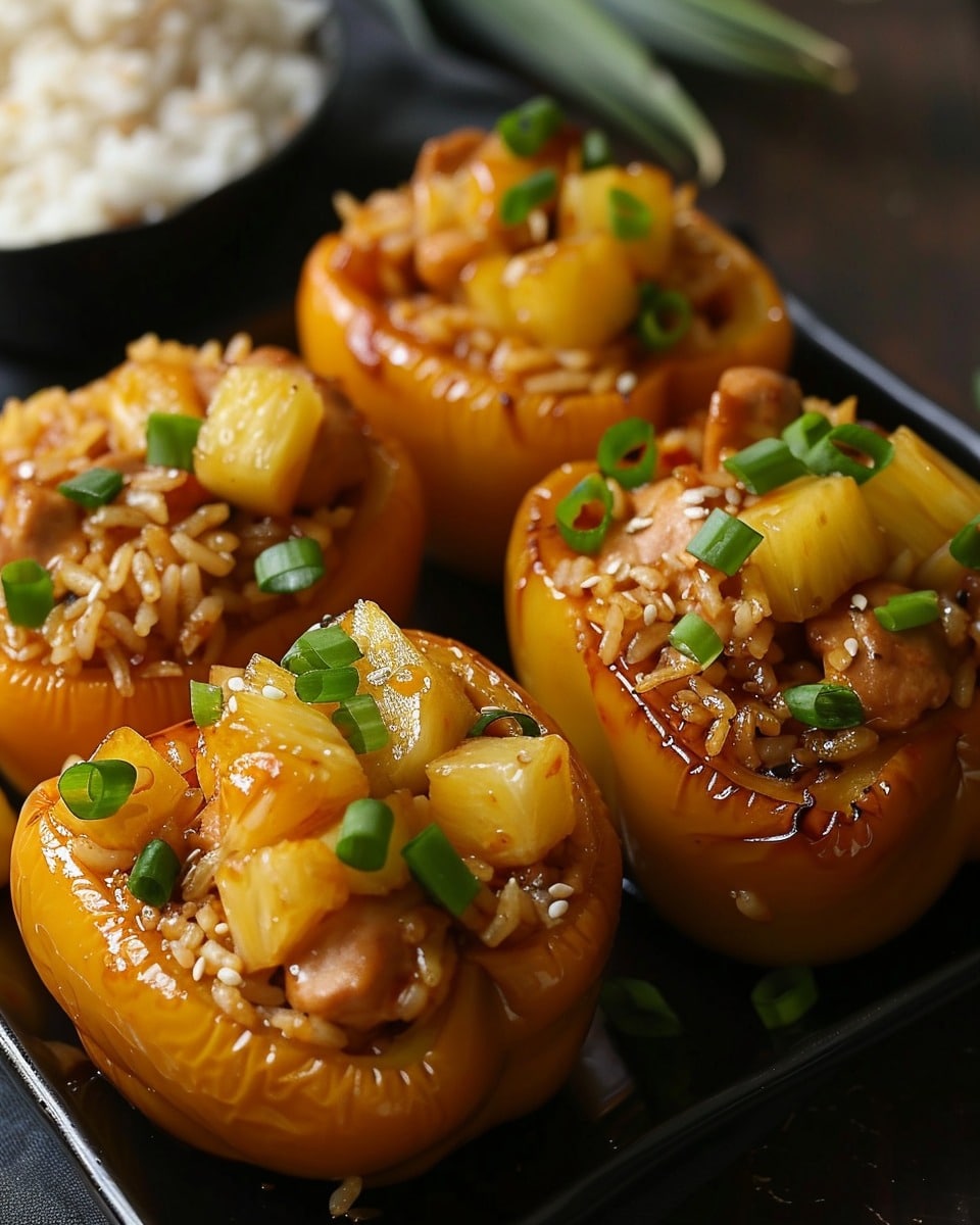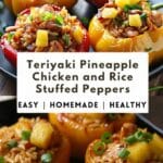 Colorful bell peppers stuffed with tender teriyaki chicken, sweet pineapple, and fluffy rice, baked until tender for a complete sweet-and-savory meal.