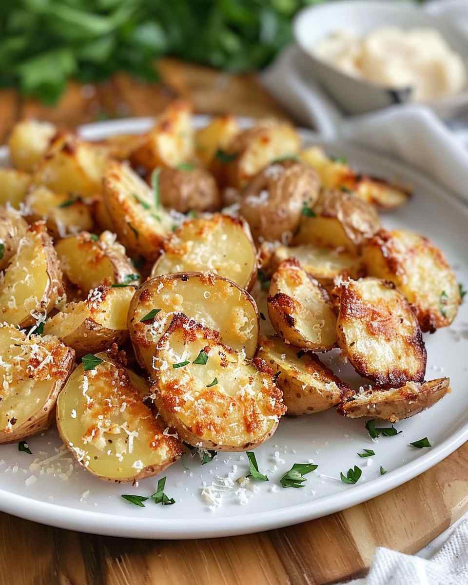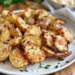 - Roast for 30–35 minutes until potatoes are tender and the parmesan forms a golden crust.