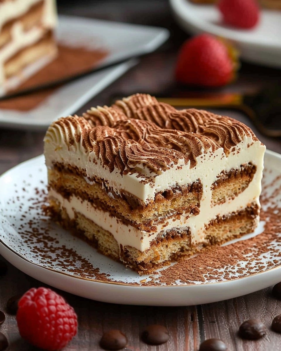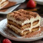 A classic Italian no-bake dessert made with layers of coffee-soaked ladyfingers and a rich mascarpone cream, finished with a dusting of cocoa powder for an elegant and indulgent treat.
