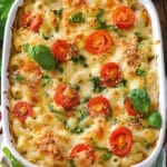 Tomato Basil Baked Macaroni and Cheese is a cozy, flavorful twist on the classic comfort food. I take creamy, cheesy pasta and layer it with roasted tomatoes and fresh basil, then bake it until golden and bubbling. It’s rich, comforting, and full of bright, herby flavor that makes it feel extra special.
