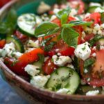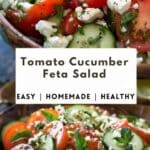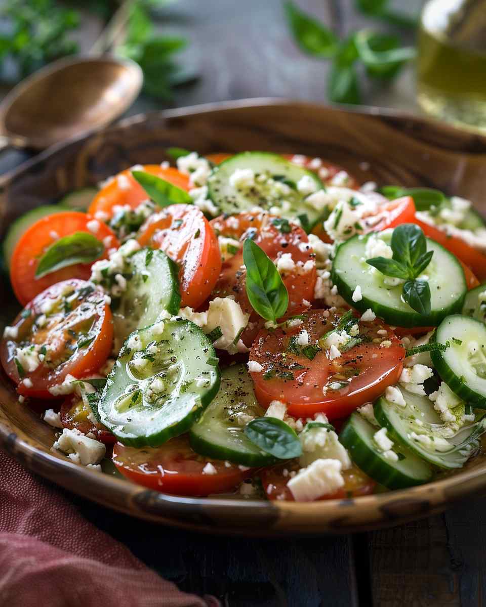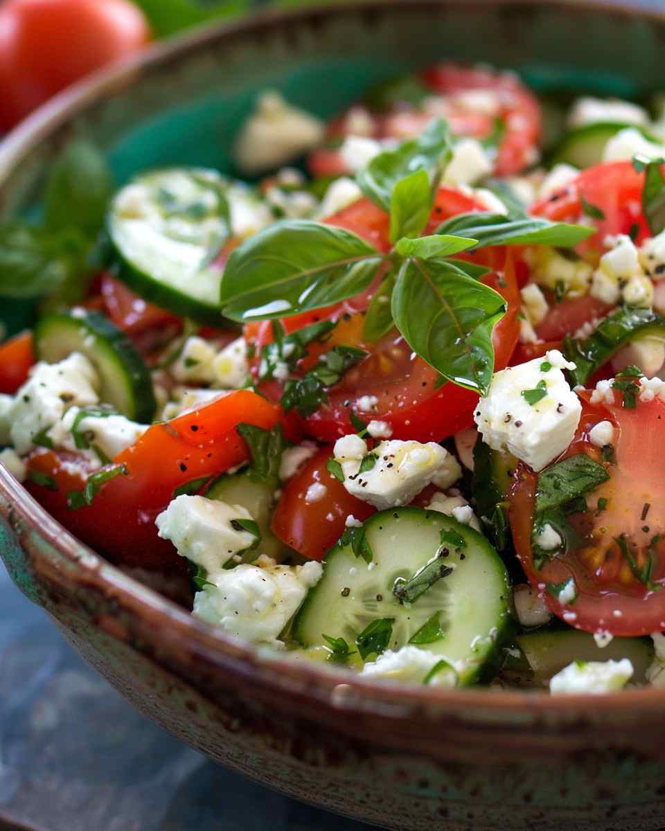 A crisp and refreshing tomato cucumber feta salad with simple Mediterranean flavors, featuring juicy tomatoes, crunchy cucumbers, and tangy feta in a light dressing.