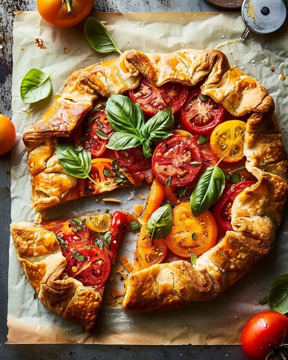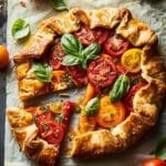 A rustic tomato galette made with flaky pastry, juicy ripe tomatoes, savory cheese, and fresh herbs. This simple free-form tart bakes until golden and crisp, creating a flavorful dish perfect for lunch, brunch, or a light dinner.