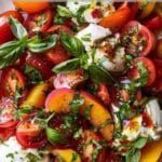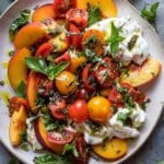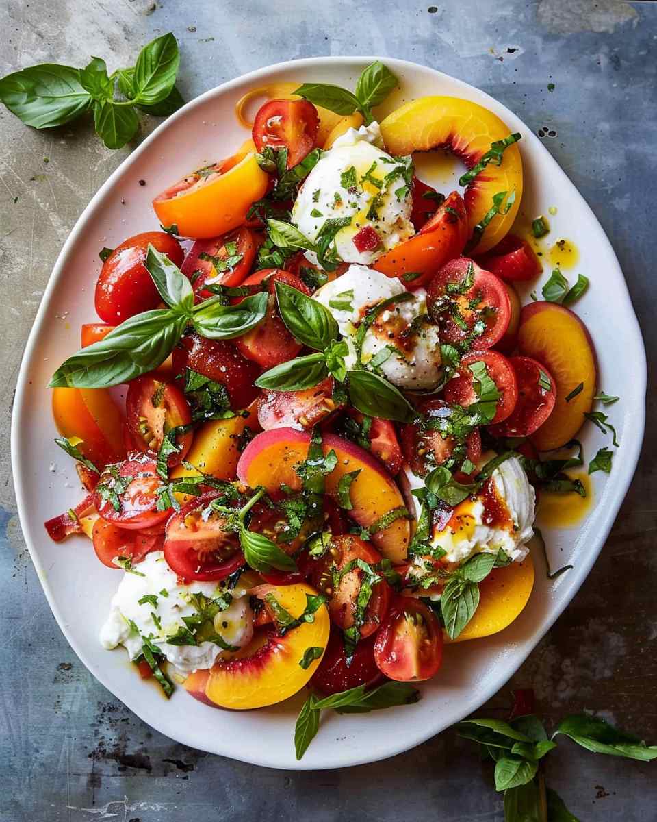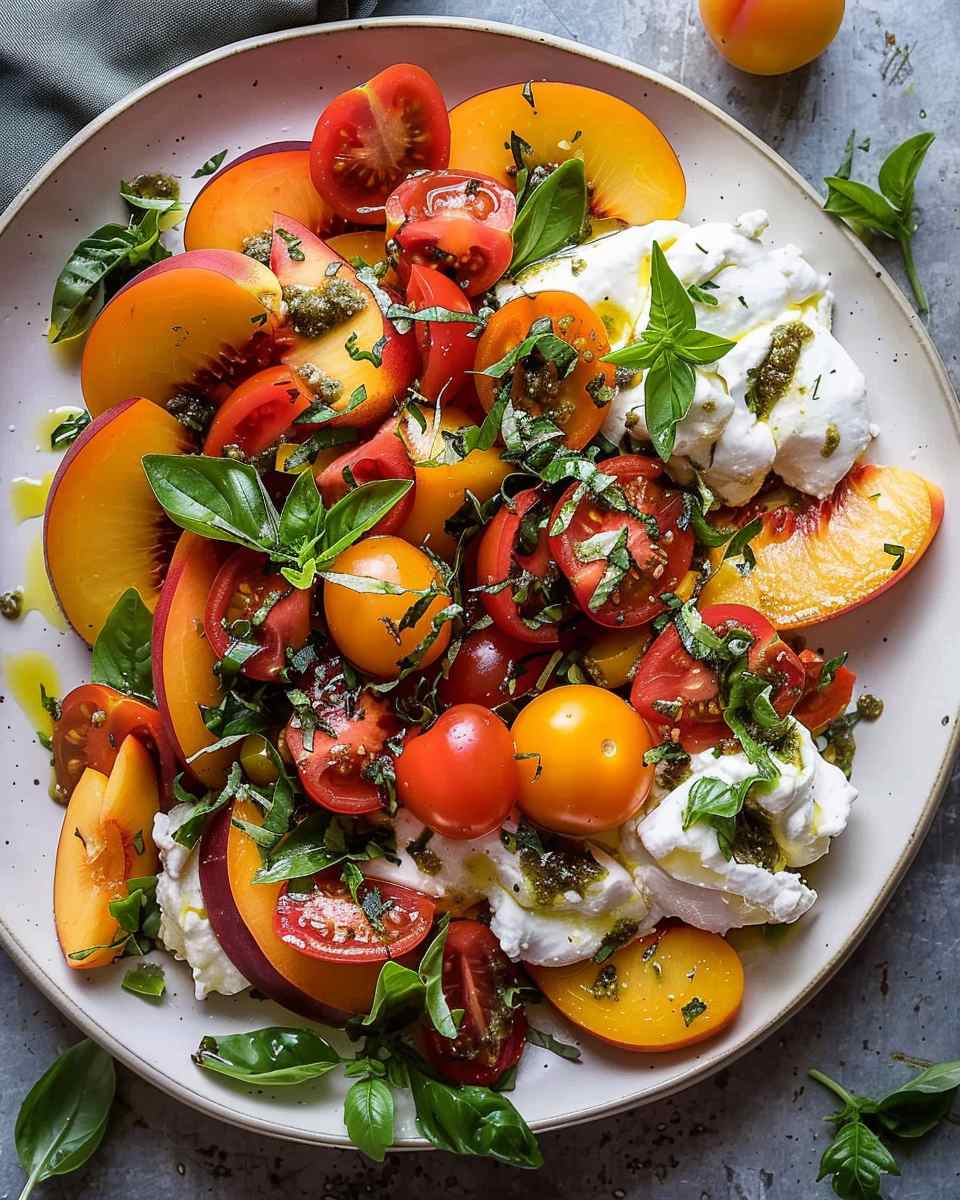 A fresh and elegant tomato, peach, and burrata salad that combines sweet fruit, juicy tomatoes, and creamy cheese with a light balsamic finish.