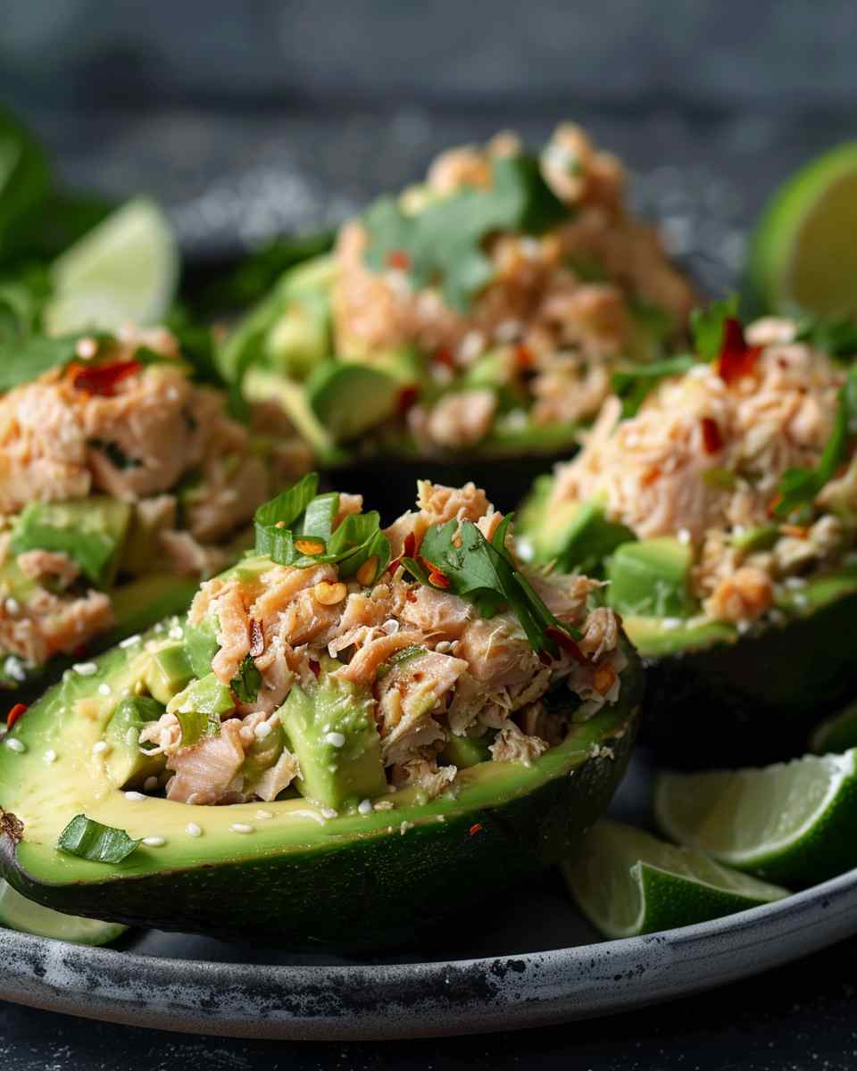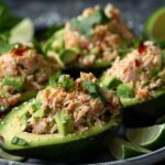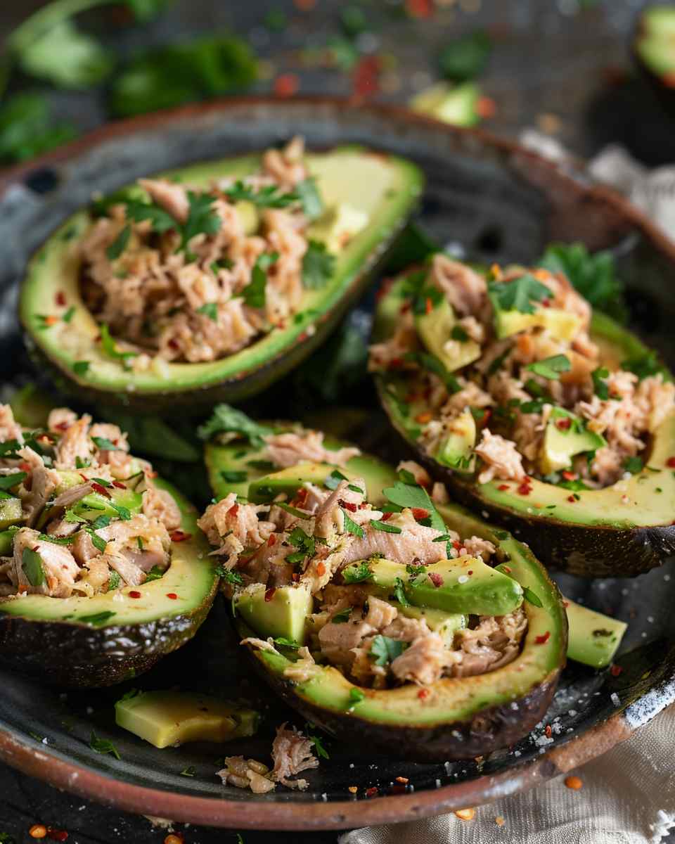 Quick and healthy tuna stuffed avocados filled with a creamy, savory tuna mixture. This light yet satisfying dish combines fresh ingredients and protein for an easy, nutritious meal.