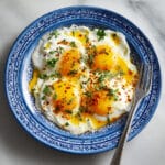 A rich and comforting Turkish poached eggs dish (Çılbır) featuring soft poached eggs served over garlicky yogurt and topped with warm spiced butter.