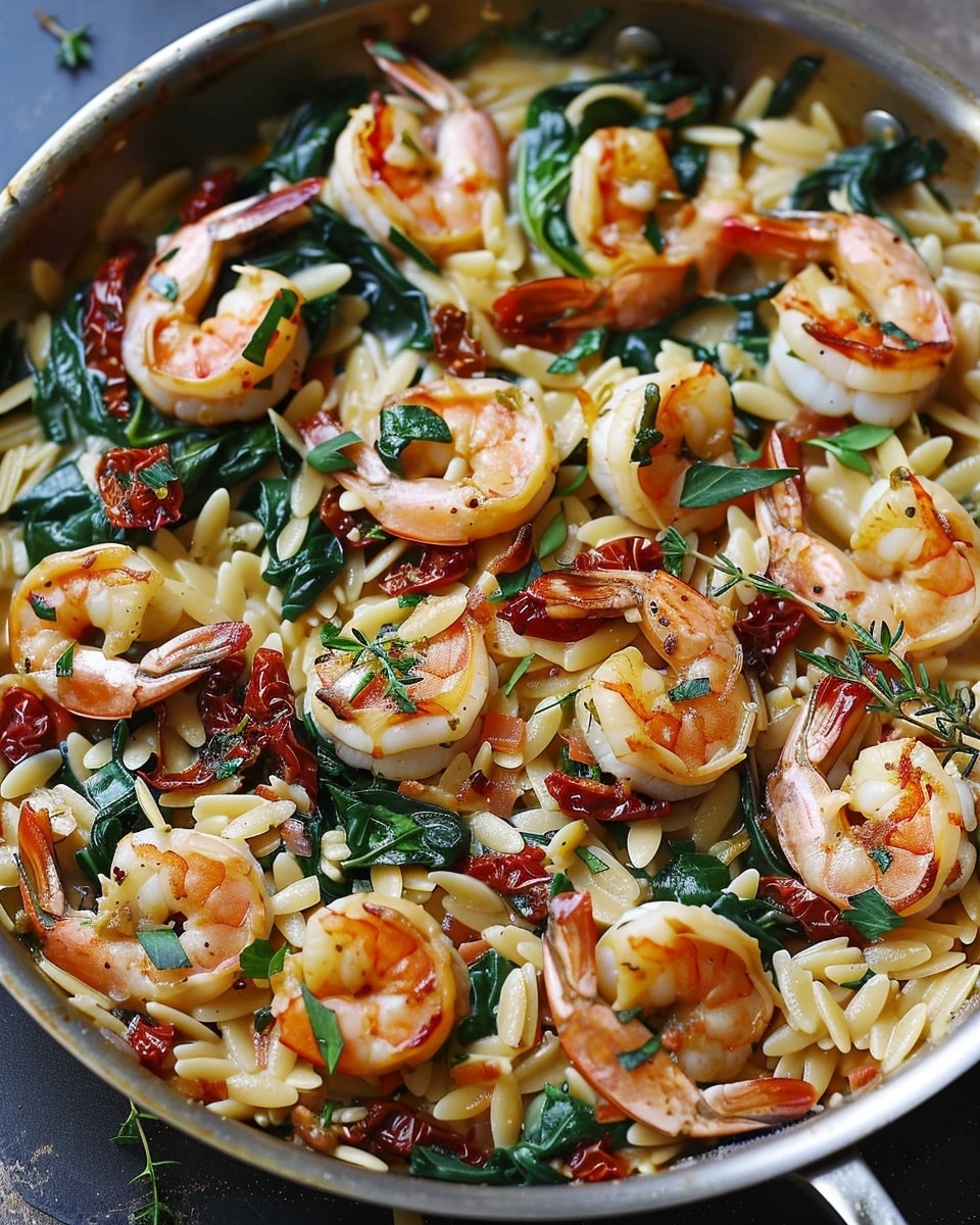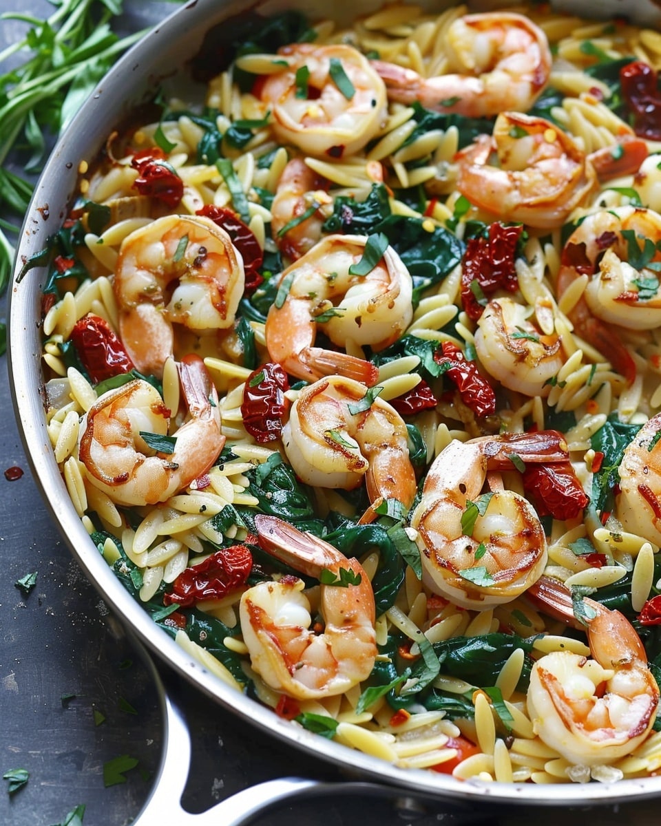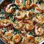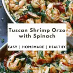 Tuscan Shrimp Orzo with Spinach is a quick, creamy, and flavorful one-pan dinner that’s perfect for busy weeknights. Tender orzo pasta is simmered in a garlicky, Parmesan-laced Tuscan sauce with sun-dried tomatoes, juicy shrimp, and fresh spinach. This easy shrimp orzo recipe is packed with Italian-inspired flavor and comes together in just 30 minutes.
