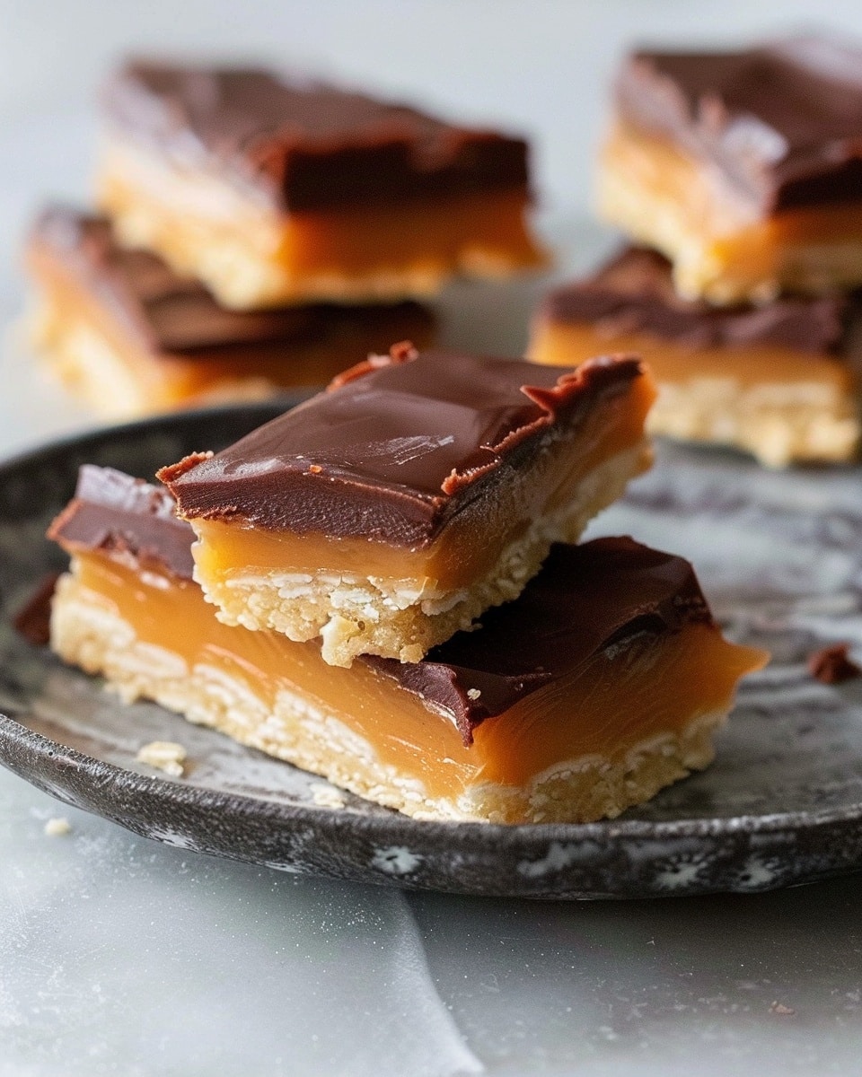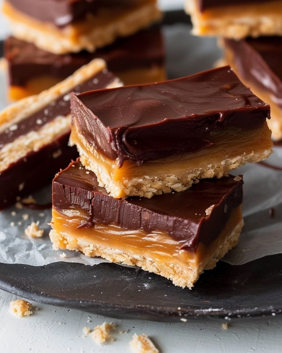 I like this recipe because it gives me full control over the ingredients while still delivering that irresistible combo of crunch, chew, and chocolate. The shortbread is crisp and buttery, the caramel is soft and gooey without being runny, and the chocolate layer adds that perfect finish. They’re easy to cut, fun to serve, and always a hit with anyone who tries them.