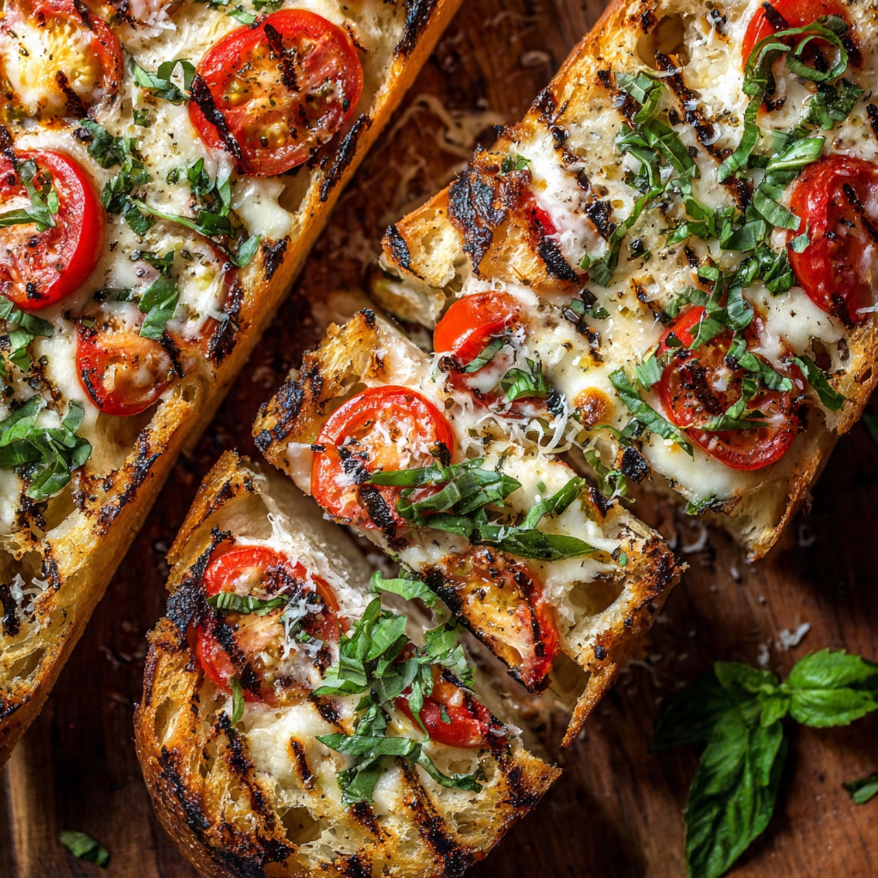 Crispy, buttery garlic bread topped with melty mozzarella, juicy tomatoes, fresh basil, and a drizzle of balsamic glaze for a fresh yet comforting Italian-inspired dish.