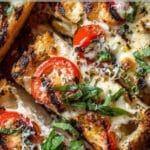 I sometimes add thin slices of fresh tomatoes instead of cherry tomatoes for a more traditional caprese look. When I want extra richness, I add a sprinkle of grated Parmesan before baking.