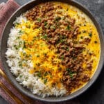 A rich and comforting rice bowl loaded with savory ground beef, buttery garlic-infused rice, and a generous layer of melted cheddar and mozzarella. This indulgent yet simple meal comes together quickly and delivers bold, satisfying flavor in every bite.
