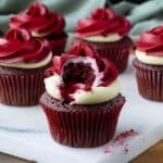 I store these cupcakes in an airtight container in the fridge for up to 4 days. If I want to serve them warm-ish, I let them sit at room temperature for about 30 minutes before serving. I don’t recommend microwaving them, since it can make the filling run. They also freeze well (unfrosted and unfilled), and I decorate after thawing.