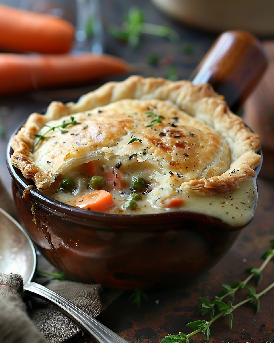 I top with puff pastry crackers or biscuit croutons for that pot pie crunch.