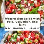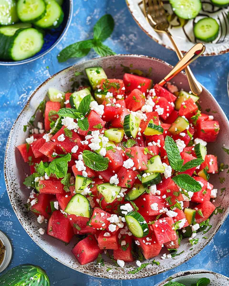 A refreshing watermelon salad with feta, cucumber, and mint, combining sweet, salty, and crisp flavors in a light and hydrating dish perfect for warm days.