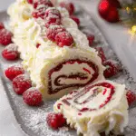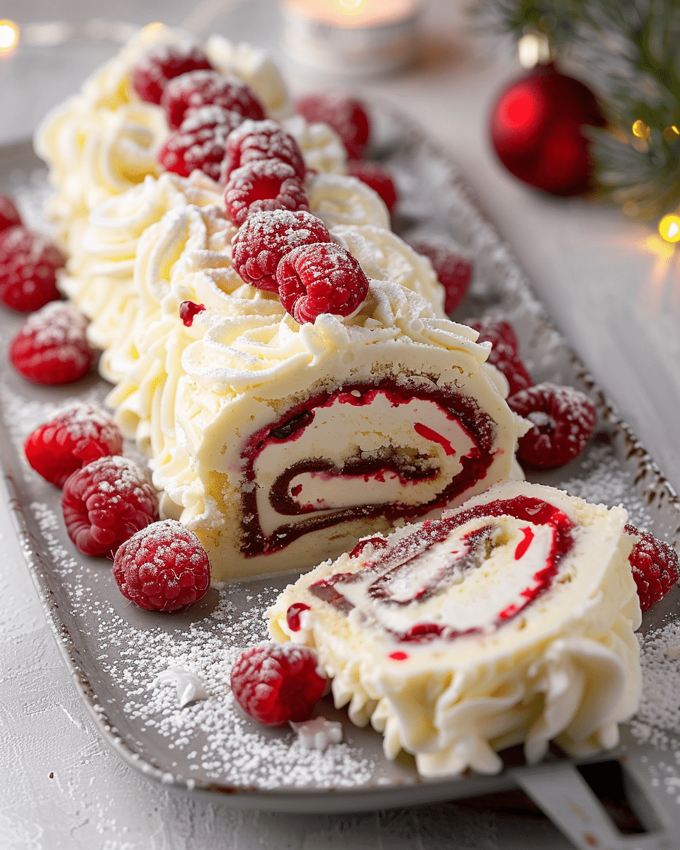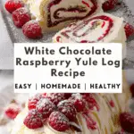 This white chocolate raspberry yule log is an elegant, festive holiday dessert with a soft vanilla sponge rolled around a tangy raspberry cream filling and topped with smooth white chocolate ganache. Light, creamy, and full of seasonal flair.